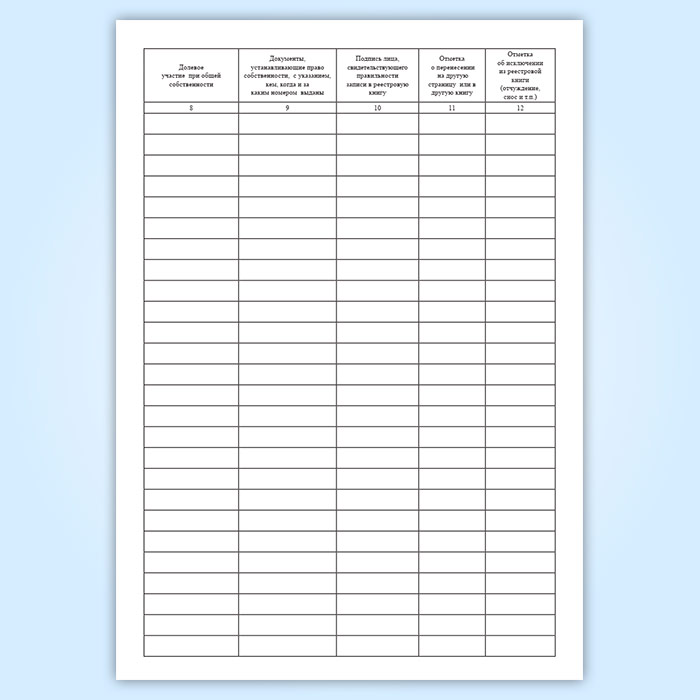 Записи в реестровой книге ведутся по улицам (по алфавиту улиц), причем на каждого собственника или участника общей долевой собственности в книге отводится не менее десяти запасных строк для текущей регистрации последующих изменений. Если эти строки в процессе регистрации будут заполнены, дальнейшая запись производится на новой странице в конце всех записей, а в книге делается отметка о переносе записей по данному строению на новую страницу, с указанием номера последней.