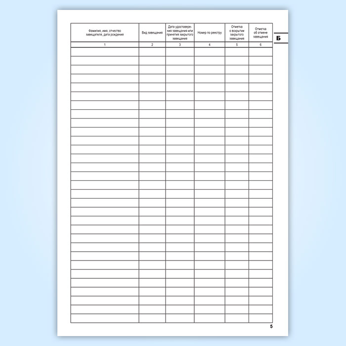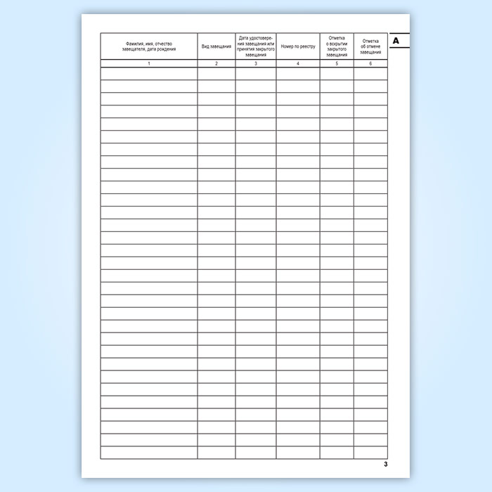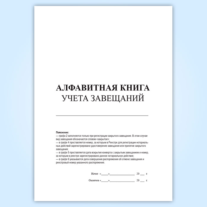 Форма алфавитной книга учети завещаний соответствует Приложению 22 к Приказу Минюста России от 16.04.2014 N 78 " Об утверждении Правил нотариального делопроизводства"
