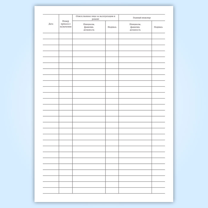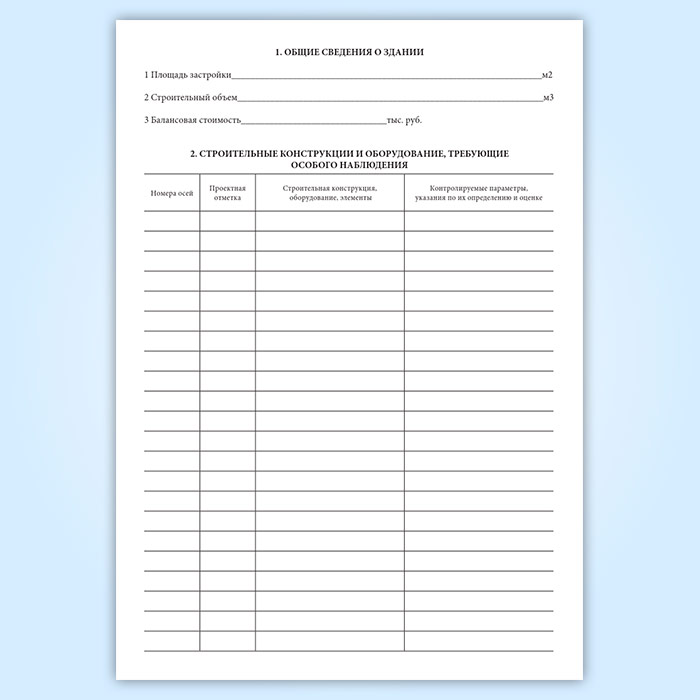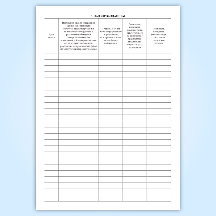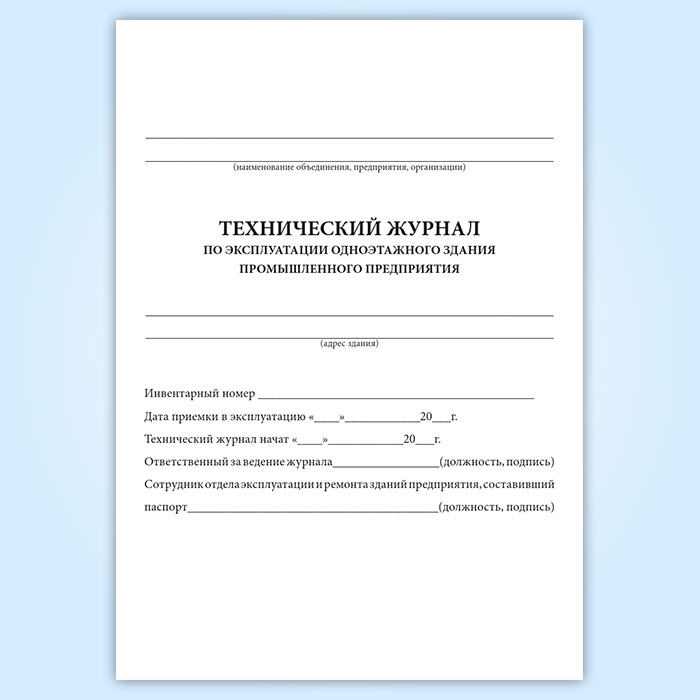 Форма технического журнала по эксплуатации одноэтажного здания промышленного предприятия соответствует приложению Б к СП 303.1325800.2017 Здания одноэтажные промышленных предприятий. Правила эксплуатации. Технический журнал по эксплуатации здания следует составлять в одном экземпляре. В технический журнал вносятся записи о всех выполненных работах по осмотрам, обслуживанию и текущему ремонту с указанием вида работ и места их проведения (наименование помещения, его номер по экспликации, оси отметки и др.) В технический журнал необходимо вносить данные о виде и составе антикоррозионного покрытия, схеме технологического процесса окраски и режимов подготовки поверхности, нанесения и сушки покрытия.