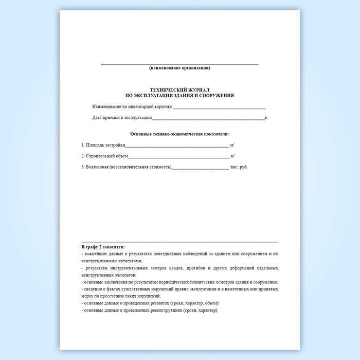 Форма технического журнала по эксплуатации здания, сооружения соответствует Приложению 2 к Постановлению Госстроя СССР от 29.12.1973 N 279 "Об утверждении Положения о проведении планово-предупредительного ремонта производственных зданий и сооружений" (вместе с "МДС 13-14.2000... "), Приложению 42 к Правилам организации технического обслуживания и ремонта объектов электроэнергетики, а также Приложению 10 к ПОТ РО 14000-004-98 Положение. Техническая эксплуатация промышленных зданий и сооружений.
