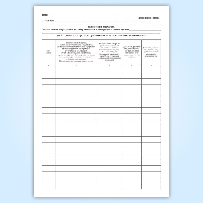 2 Наименование помещения, здания или сооружения; ось, ряд, отметка. Замеченные нарушения требований содержания здания, сооружения; неисправности строительных конструкций. Результаты наблюдений (измерений), оценка неисправностей. Номер и дата приказа, распоряжения, разрешающих производство работ или эксплуатацию. Наименование акта или других документов