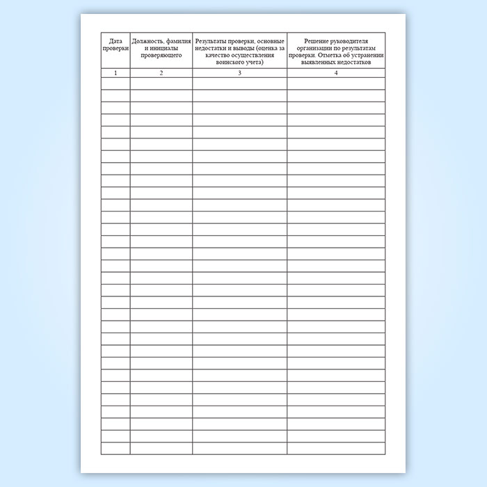 Журнал проверок осуществления воинского учета и бронирования граждан, пребывающих в запасе Вооруженных Сил, должен быть зарегистрирован, пронумерован, прошнурован, опечатан и заверен подписью руководителя организации (военного комиссара, руководителя органа местного самоуправления). Графа 4 заполняется только в организации.