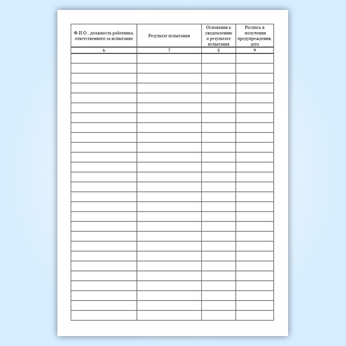 Ведение учета прохождения испытания осуществляется в журнале, где фиксируется Ф.И.О. работника ответственного за испытание и результат испытания.