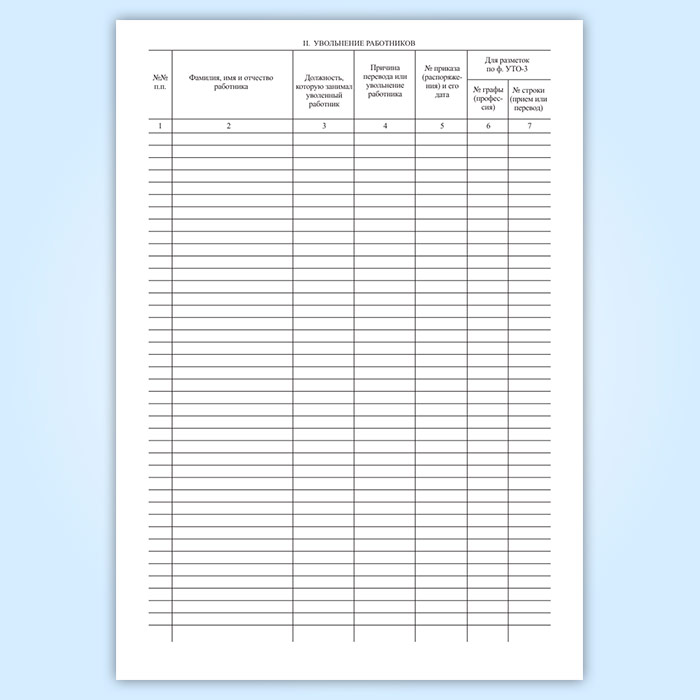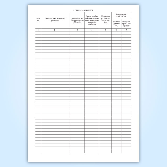 Книга учета принятых и уволенных сотрудников имеет разделы и графы: