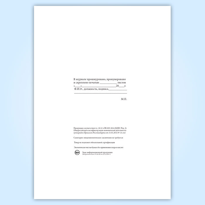 - журнал должен быть прошнурован, концы шнура приклеены небольшим листком бумаги к внутренней стороне обложки;