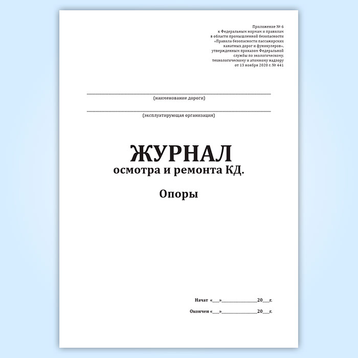 Форма журнала осмотра и ремонта канатной дороги. Опоры (№6) соответствует Приложению 6 к Приказу Ростехнадзора от 13.11.2020 N 441 "Об утверждении федеральных норм и правил в области промышленной безопасности "Правила безопасности пассажирских канатных дорог и фуникулеров".