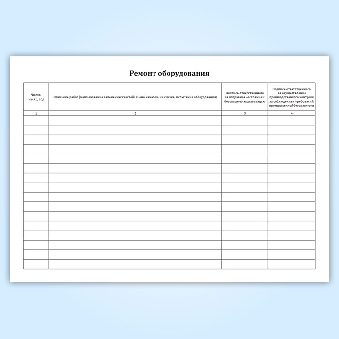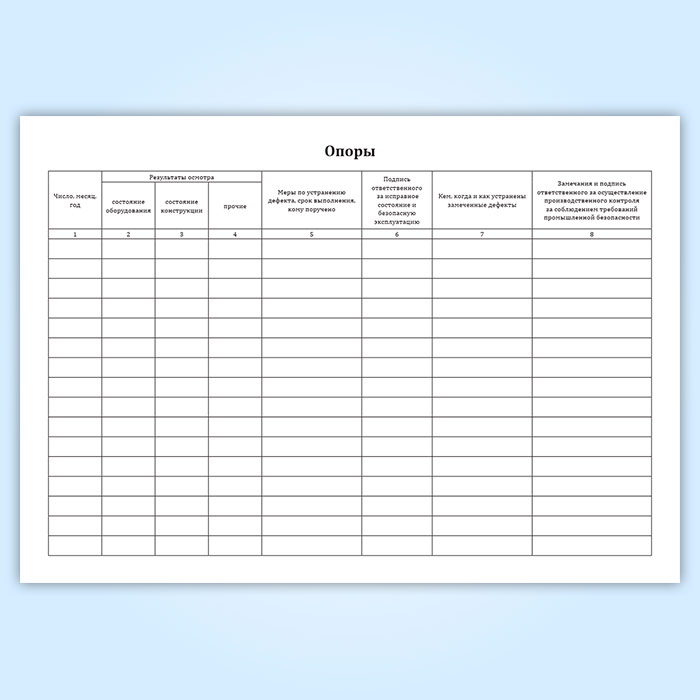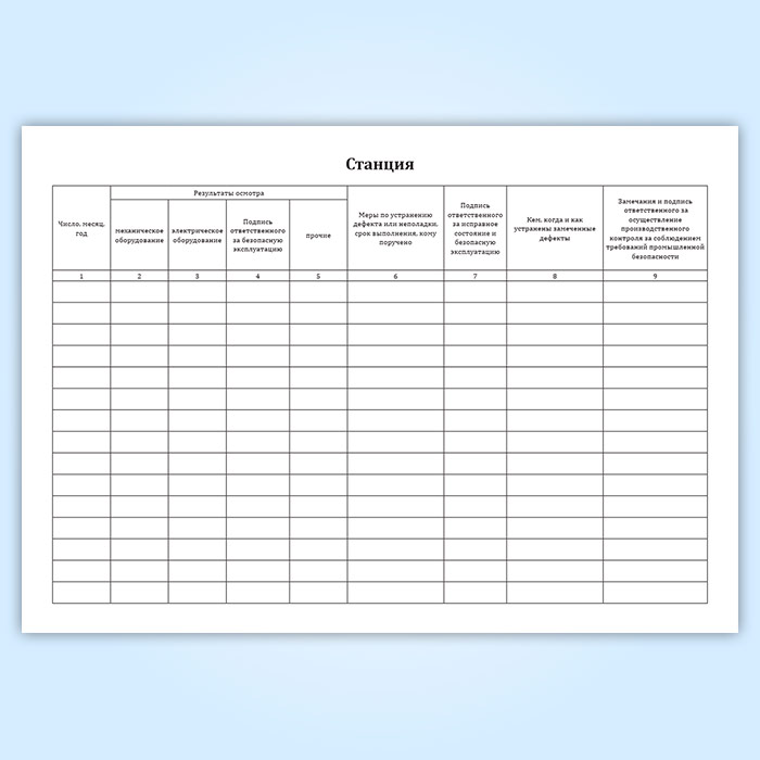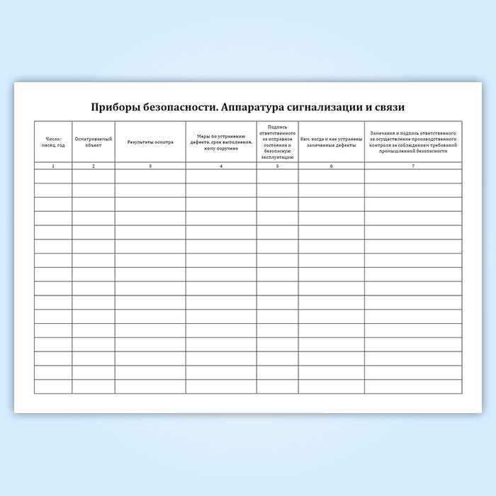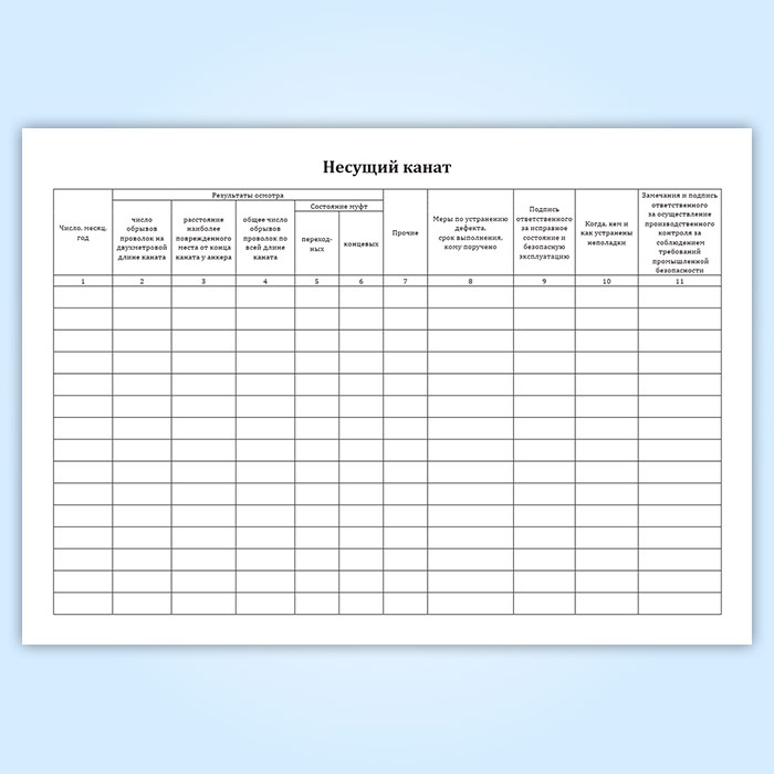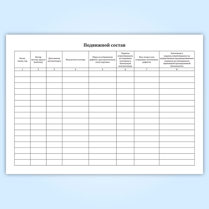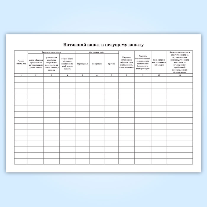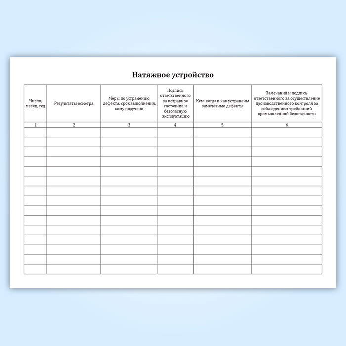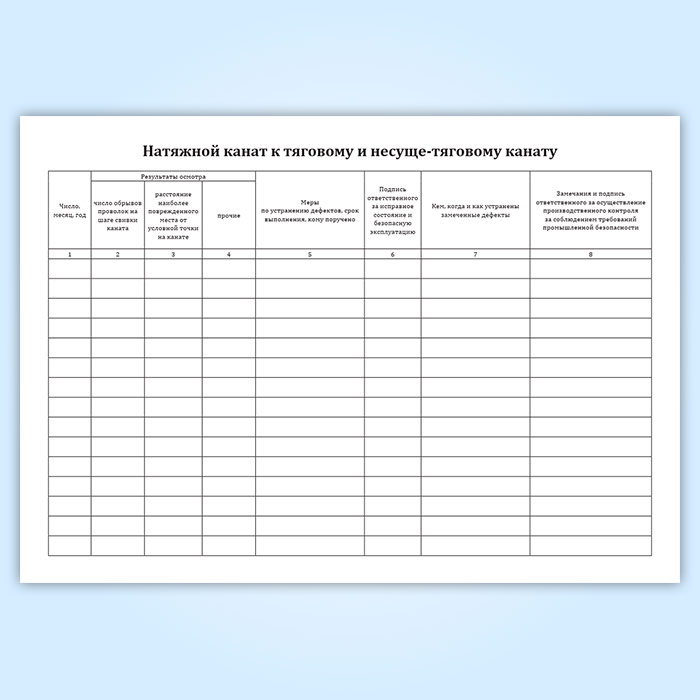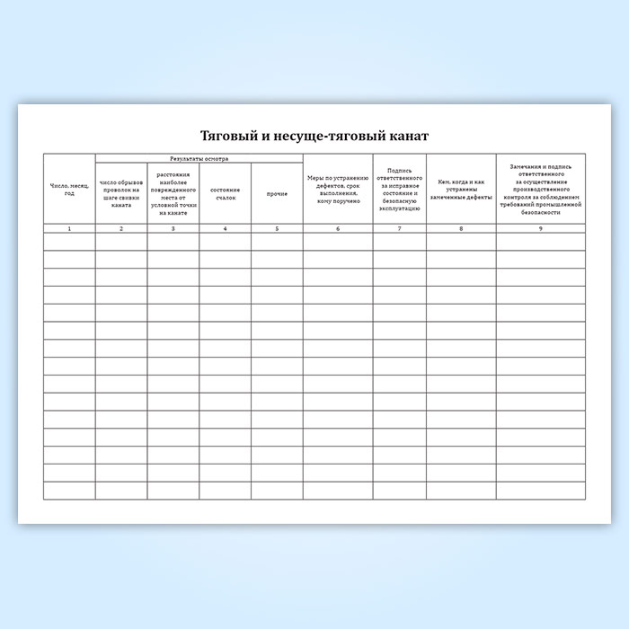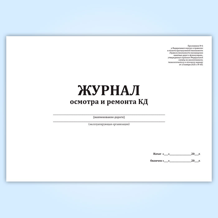 Форма журнала соответствует Приложению N 6 к Приказу Ростехнадзора от 13.11.2020 N 441 " Об утверждении федеральных норм и правил в области промышленной безопасности " Правила безопасности пассажирских канатных дорог и фуникулеров"