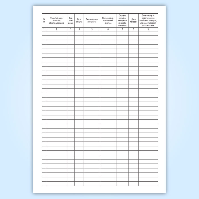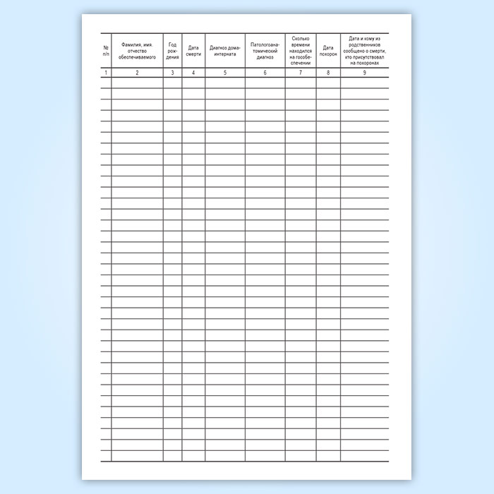 Учреждение в данном журнале ведет учет регистрации умерших, фиксируя в нем Ф.И.О, дату рождения и смерти, причину смерти, время нахождения на гособеспечении, уведомление родственников и дату похорон.