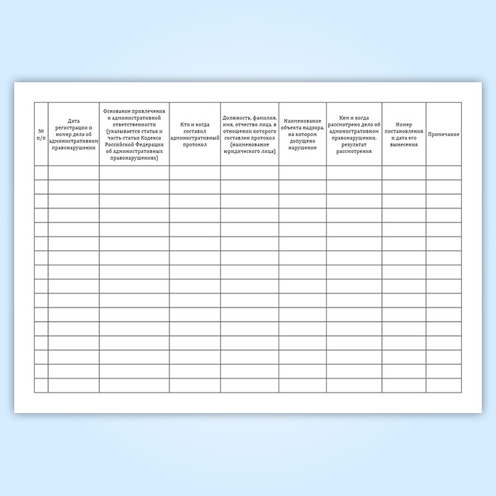 Журнал регистрации дел об административных правонарушениях, возбужденных должностными лицами отдела государственного лесного контроля и пожарного надзора Департамента лесного хозяйства по Центральному федеральному округу имеет графы: