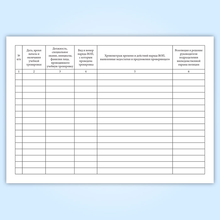 Форма журнала учета учебных тренировок соответствует Приложению N 18 к Наставлению по организации деятельности строевых подразделений вневедомственной охраны полиции