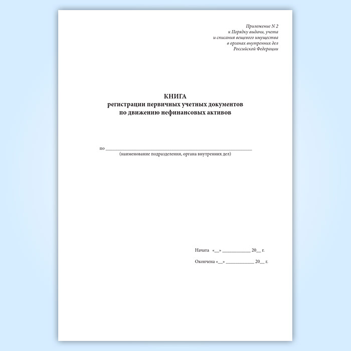 Форма Книги регистрации первичных учетных документов по движению нефинансовых активов соответствует Приложению 2 к Приказу МВД России № 725 "Об утверждении Порядка выдачи, учета и списания вещевого имущества в органах внутренних дел Российской Федерации" от 26.07.2012 года.