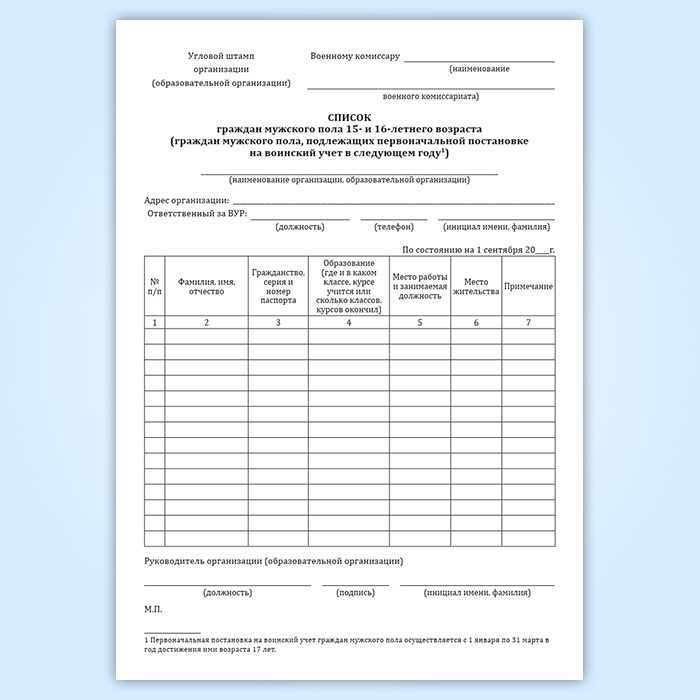 1. Списки граждан мужского пола 15- и 16-летнего возраста составляются в алфавитном порядке, заверяются печатью организации (образовательной организации) и представляются в военные комиссариаты по месту жительства (месту пребывания) граждан ежегодно, в срок до 15 сентября. На работающих граждан списки составляются на основании личных карточек работников (форма N Т-2).