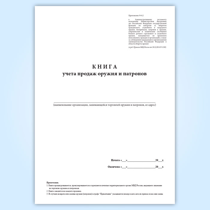 Форма книги учета продаж оружия и патронов соответствует Приложению 8.2 к Приказу МВД России от 29.06.2012 N 646 "Об утверждении Административного регламента исполнения Министерством внутренних дел Российской Федерации государственной функции по контролю за оборотом гражданского, служебного и наградного оружия, боеприпасов, патронов к оружию, сохранностью и техническим состоянием боевого ручного стрелкового и служебного оружия, находящегося во временном пользовании у граждан и организаций, а также за соблюдением гражданами и организациями законодательства Российской Федерации в области оборота оружия"