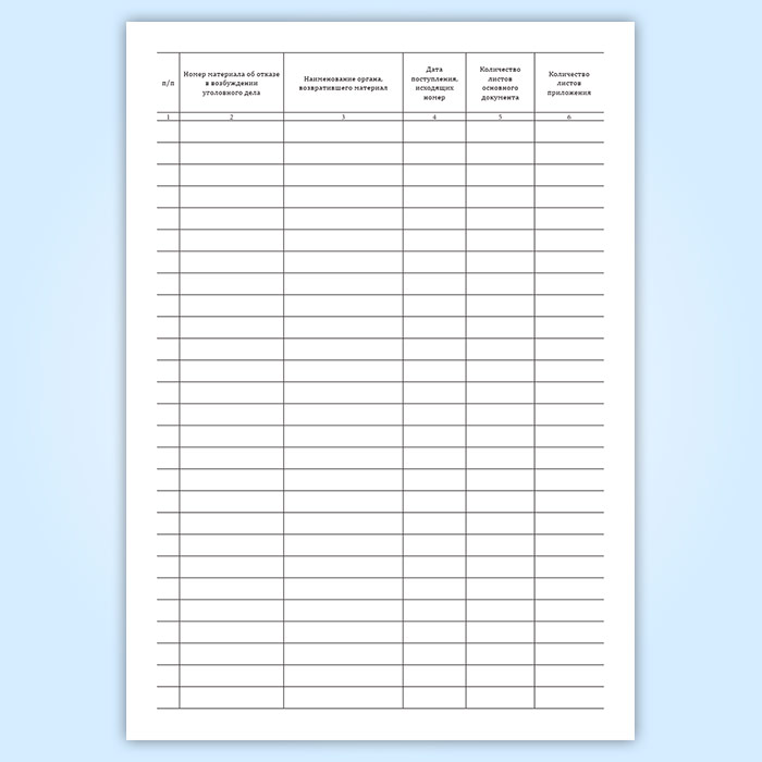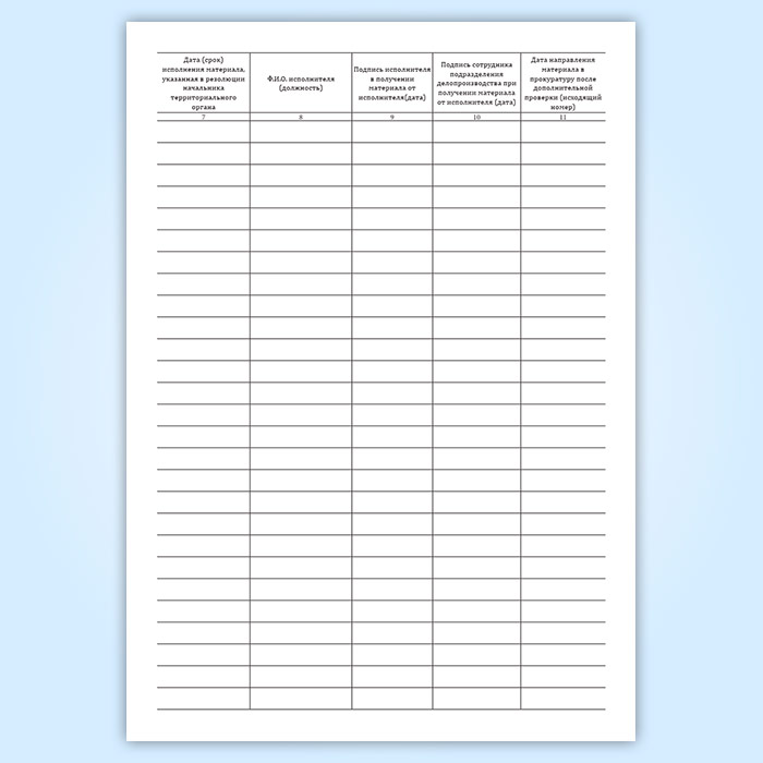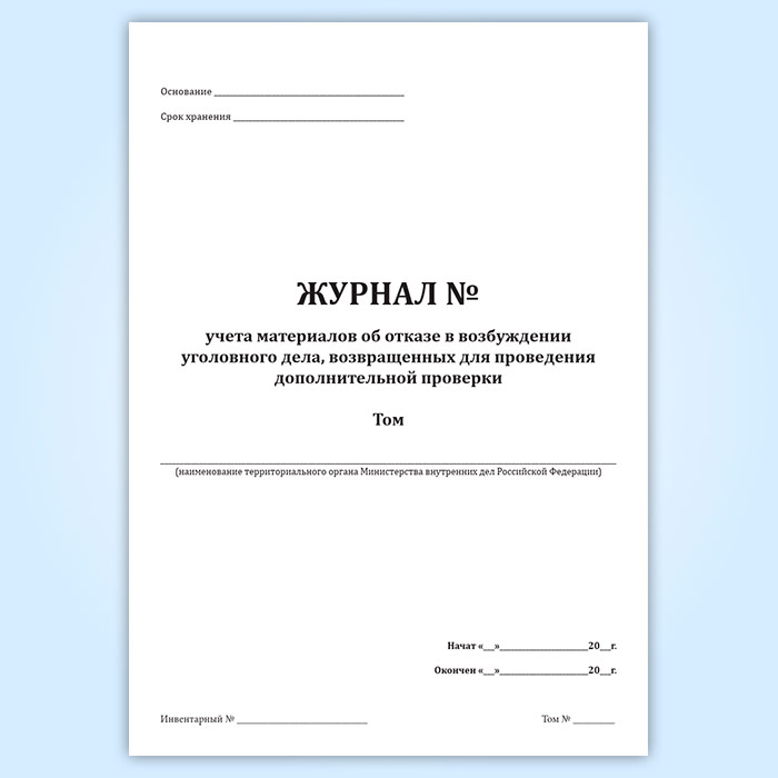 Учет материалов об отказе в возбуждении уголовного дела, возвращенных для проведения дополнительной проверки фиксирует в журнале сотрудник подразделения делопроизводства при получении материала от исполнителя.