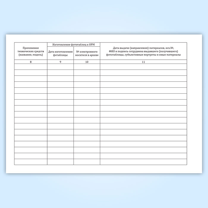 11. Дата выдачи (направления) материалов, исх.№, ФИО и подпись сотрудника выдавшего (получившего) фототаблицы, субъективные портреты и иные материалы