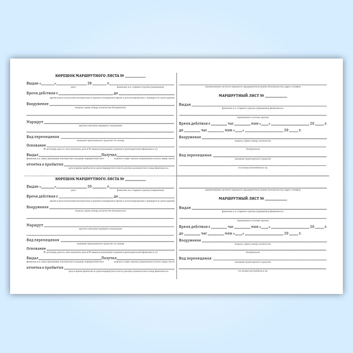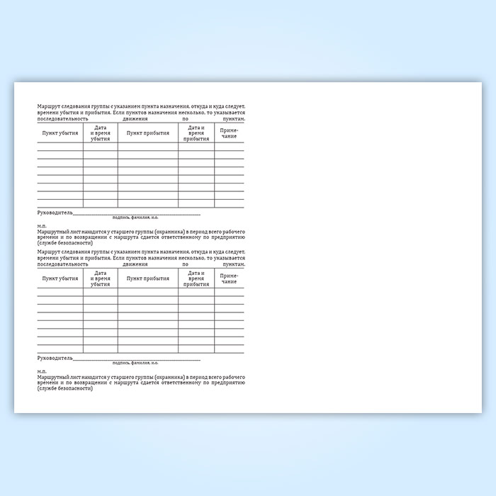Маршрут следования группы с указанием пункта назначения, откуда и куда следует, времени убытия и прибытия фиксируется в книге маршрутных листов. Если пунктов назначения несколько, то указывается последовательность движения по пунктам. Маршрутный лист находится у старшего группы (охранника) в период всего рабочего времени и по возвращении с маршрута сдается ответственному по предприятию (службе безопасности).