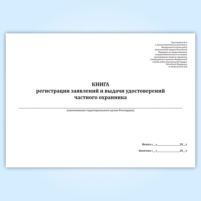 Форма журнала соответствует Приложению 6 к Приказу Росгвардии от 28.06.2019 N 228 " Об утверждении Административного регламента Федеральной службы войск национальной гвардии Российской Федерации по предоставлению государственной услуги по выдаче удостоверения частного охранника"