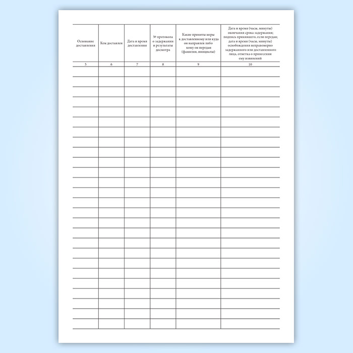 10. Дата и время (часы, минуты) окончания срока задержания; подпись принявшего, если передан; дата и время (часы, минуты) освобождения неправомерно задержанного или доставленного лица, отметка о принесении ему извинений