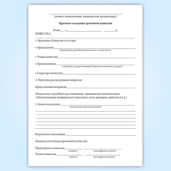 Решение врачебной комиссии оформляется в виде протокола. Для регистрации протоколов заседания врачебной комиссии используется журнал, в котором указывается состав врачебной комиссии, перечень рассмотренных вопросов, решение и результаты голования комиссии.