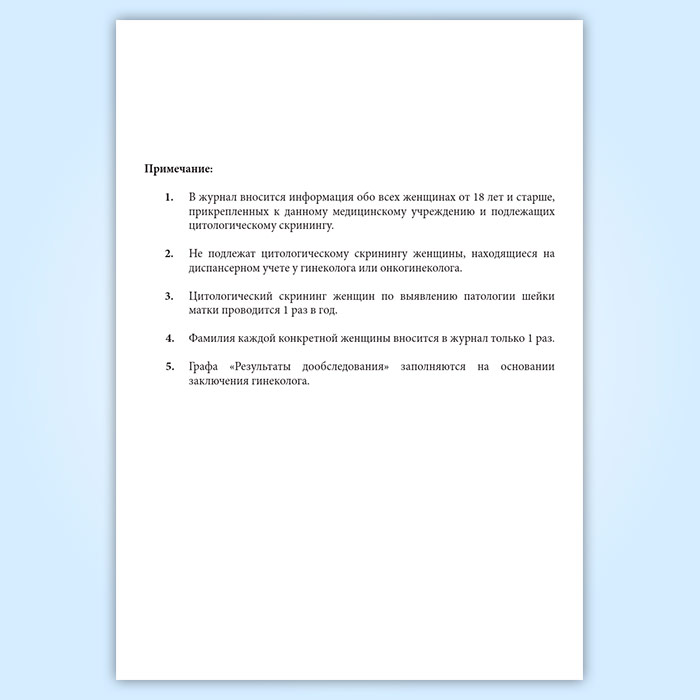 1. В журнал вносится информация обо всех женщинах от 18 лет и старше, прикрепленных к данному медицинскому учреждению и подлежащих цитологическому скринингу.