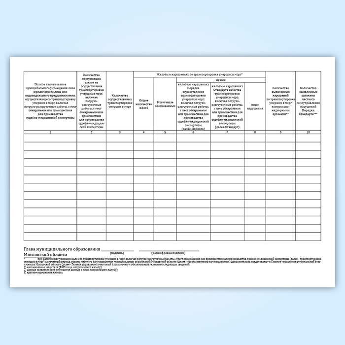Отчет о реализации государственных полномочий Московской области по транспортировке умерших в морг, включая погрузо-разгрузочные работы, с мест обнаружения или происшествия для производства судебно-медицинской экспертизы имеет графы: