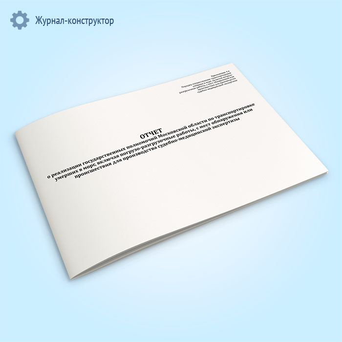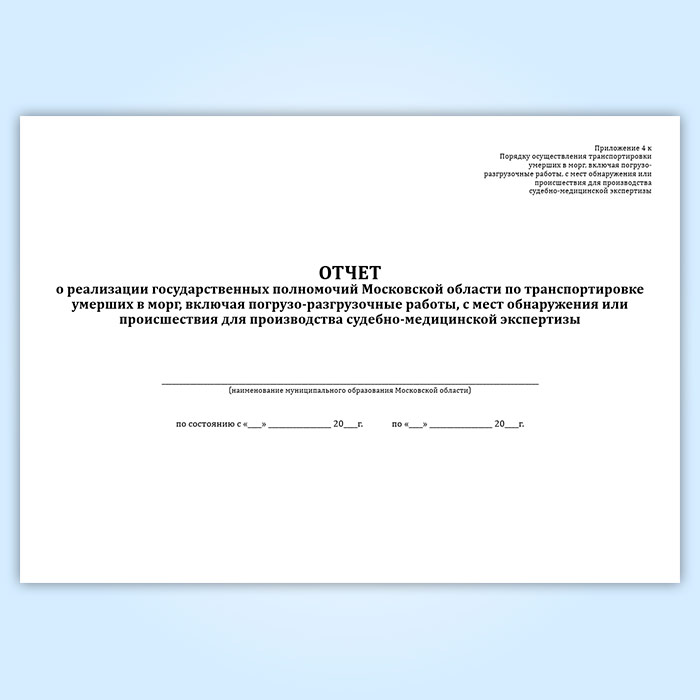 Форма журнала "Отчет о реализации государственных полномочий Московской области по транспортировке умерших в морг, включая погрузо-разгрузочные работы, с мест обнаружения или происшествия для производства судебно-медицинской экспертизы" соответствует Приложению №4 к Порядку осуществления транспортировки умерших в морг, включая погрузо-разгрузочные работы, с мест обнаружения или происшествия для производства судебно-медицинской экспертизы, утв. Постановлением Правительства Московской области от 16 октября 2019 года N 753/36.