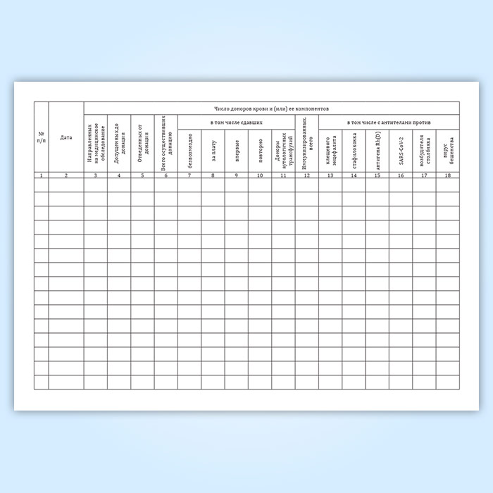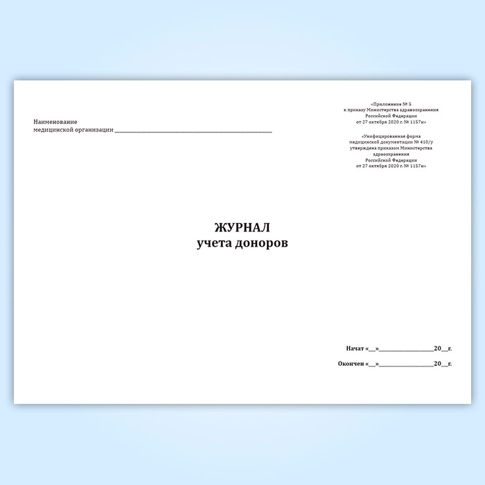 Форма журнала соответствует Приложению 5 к Приказу Минздрава России от 27.10.2020 N 1157н " Об утверждении унифицированных форм медицинской документации, в том числе в форме электронных документов, связанных с донорством крови и (или) ее компонентов и клиническим использованием донорской крови и (или) ее компонентов, и порядков их заполнения" .