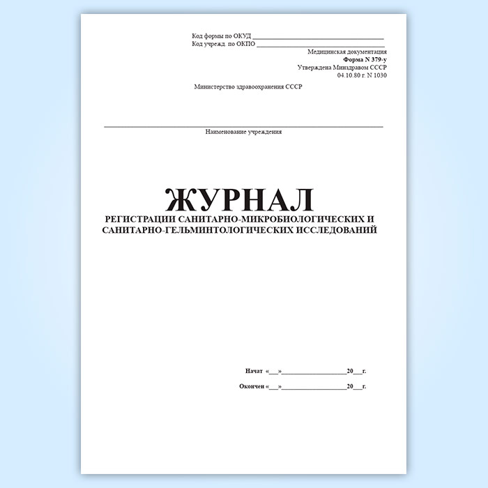 Форма журнала регистрации санитарно-микробиологических и санитарно-гельминтологических исследований форма 379-у, утверждена Приказом Минздрава СССР «Об утверждении форм первичной медицинской документации учреждений здравоохранения» от 4 октября 1980 г. № 1030