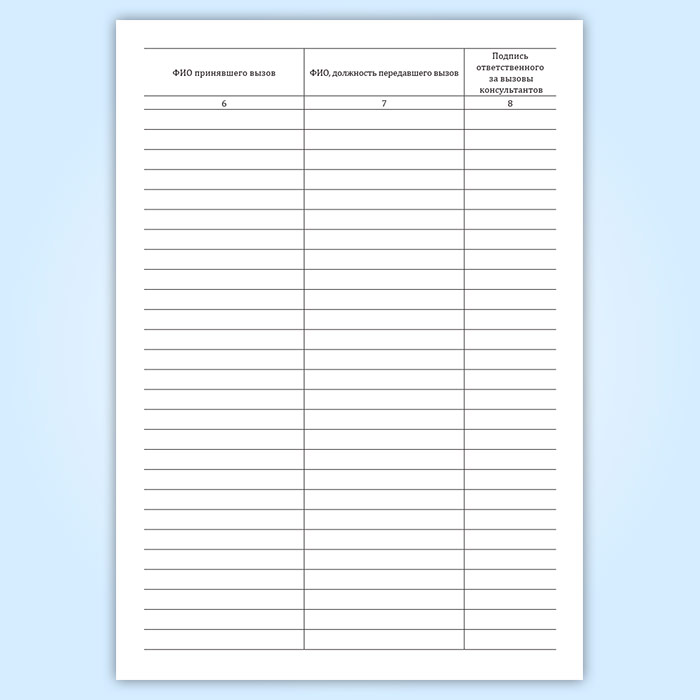 Эти же данные вносятся в журнал переданных вызовов консультантов, который ведется главным врачом лечебного учреждения либо уполномоченным им заместителем.