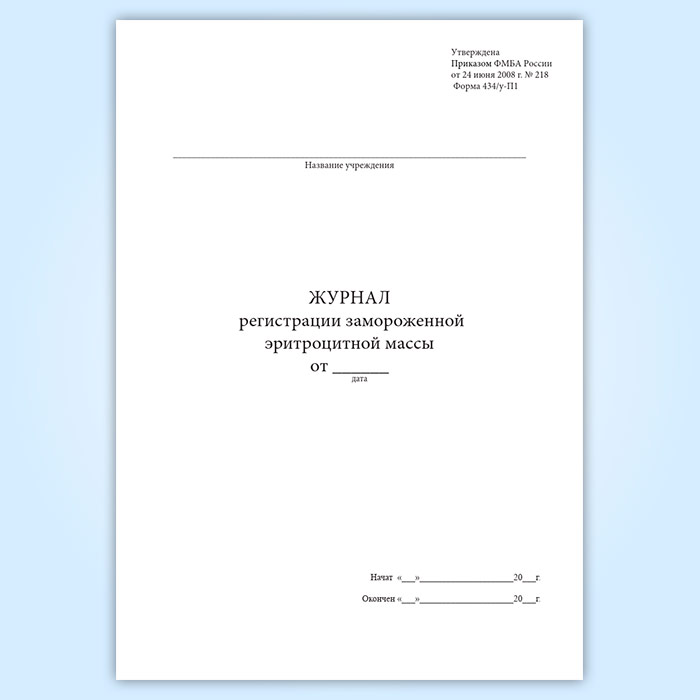 Форма журнала регистрации замороженной эритроцитной массы (Форма 434/у-П1) утверждена Приказом ФМБА России № 218 «О вводе в эксплуатацию автоматизированной системы трансфузиологии ФМБА России» от 24.06.2008, в настощее время отмененного.