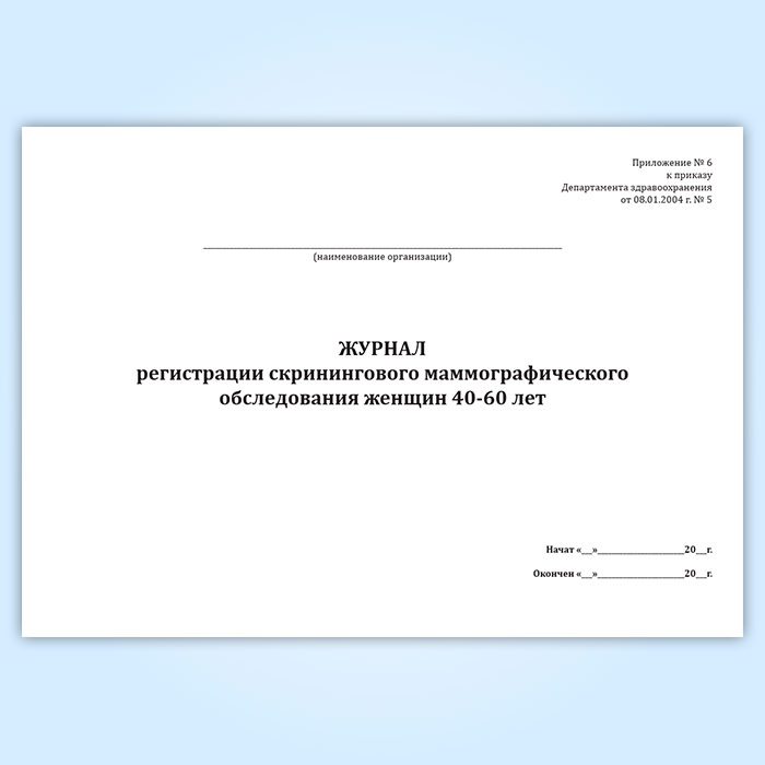 В целях дальнейшего совершенствования организации мероприятий по реализации подпрограммы "Целевая диспансеризация женского населения по выявлению заболеваний молочных желез" утверждена Форма журнала регистрации скринингового маммографического обследования женщин 40-60 лет, которая соответствует Приложению № 6 к приказу Департамента здравоохранения от 08.01.2004 г. № 5.