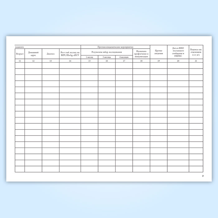 3.3. Графы 1 - 12, 20 заполняются в первые 24 часа на основании данных о медработнике, получившем травму, и сведений о пациенте из истории болезни, амбулаторной карты, другой медицинской документации.