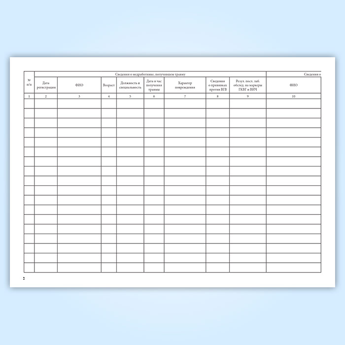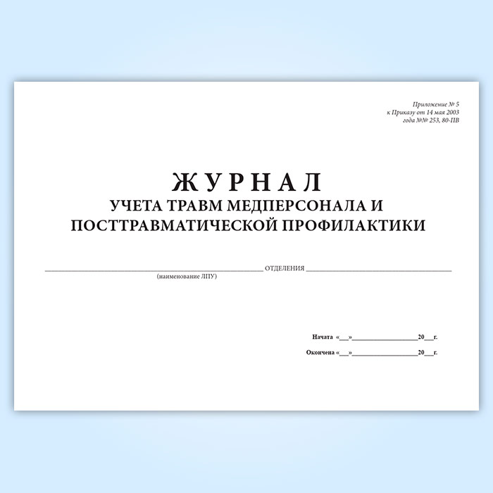 Форма журнала учета травм медперсонала и посттравматической профилактики соответствует Приложению №1 к Приказу от 14 мая 2003 года № 253, 80-ПВ " Об утверждении журнала учета травм медперсонала и посттравматической профилактики" . Ответственными лицами за ведение журнала являются: