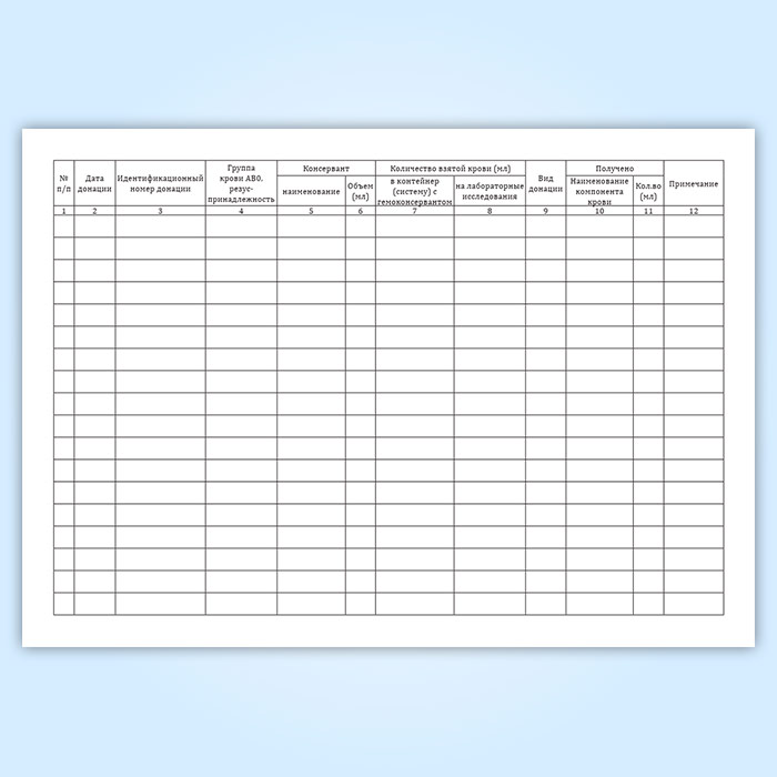 Форма журнала соответствует Приложению 7 к Приказу Минздрава России от 27.10.2020 N 1157н " Об утверждении унифицированных форм медицинской документации, в том числе в форме электронных документов, связанных с донорством крови и (или) ее компонентов и клиническим использованием донорской крови и (или) ее компонентов, и порядков их заполнения" .
