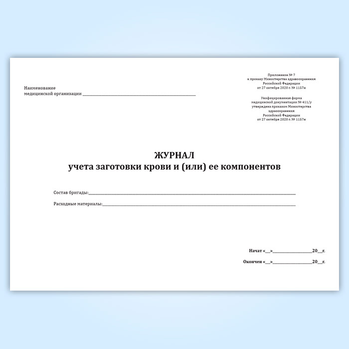 Унифицированная форма медицинской документации N 411/у "Журнал учета заготовки крови и (или) ее компонентов" ведется медицинским работником со средним профессиональным образованием в медицинской организации государственной системы здравоохранения, организацией федеральных органов исполнительной власти, в которых федеральным законом предусмотрена военная и приравненная к ней служба, осуществляющей заготовку и хранение донорской крови и (или) ее компонентов для учета заготовки крови и (или) ее компонентов.
