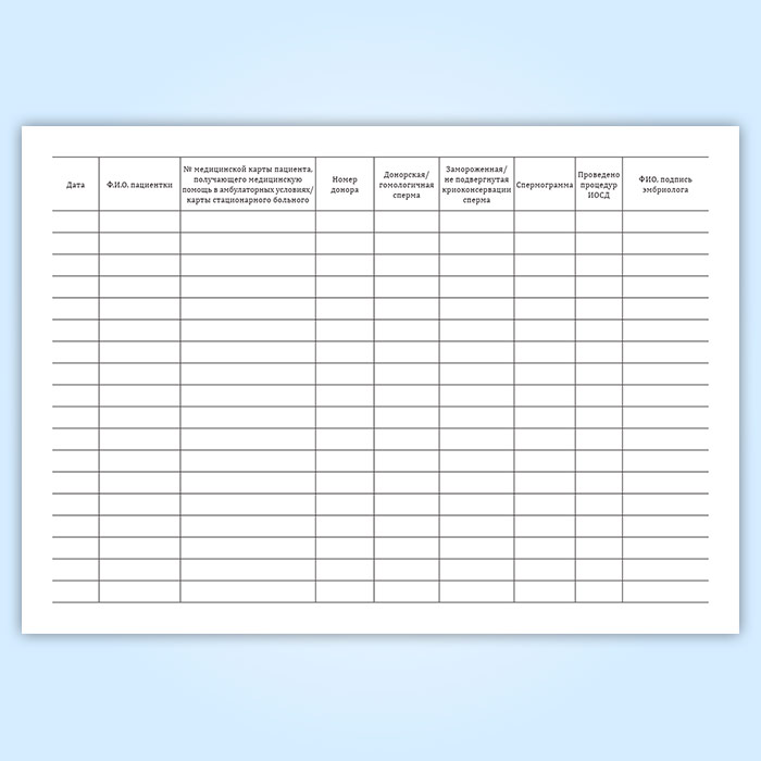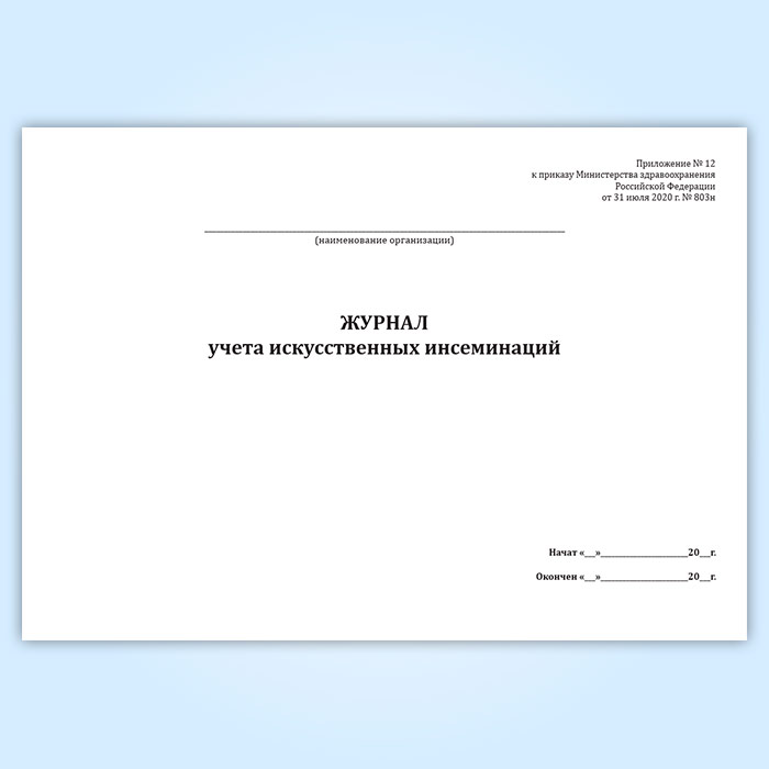 Форма журнала учета искусственных инсеминаций соответствует Приложению № 12 к Приказу Министерства здравоохранения РФ от 31 июля 2020 г. № 803н "О порядке использования вспомогательных репродуктивных технологий, противопоказаниях и ограничениях к их применению".