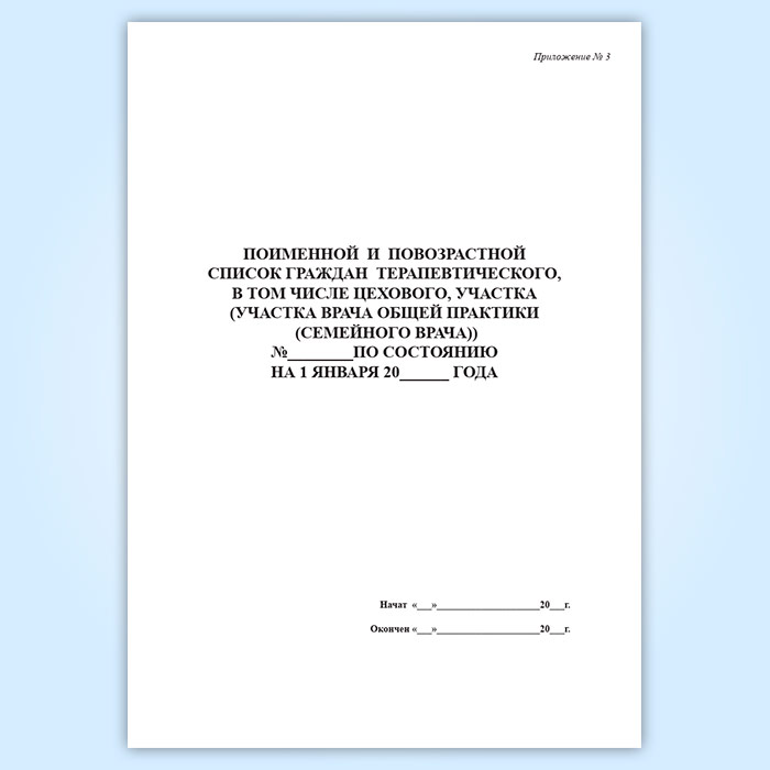 Форма Поименного и повозрастного списка граждан терапевтического, в том числе цехового, участка (участка врача общей практики (семейного врача)) соответствует Приложению 3 к письму Минздрава России № 14-2/10/2-6432 (О направлении Методических рекомендаций "Организация проведения диспансеризации и профилактических медицинских осмотров взрослого населения") от 29.08.2013 года.