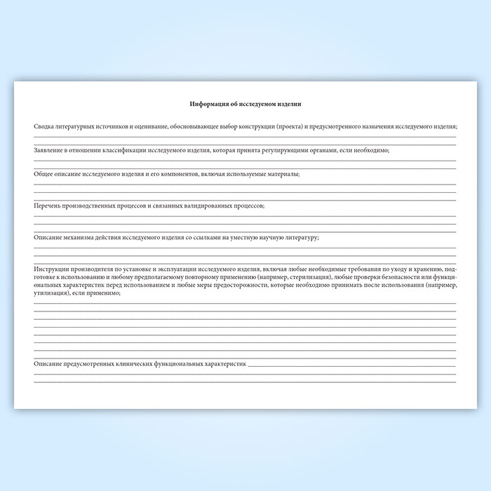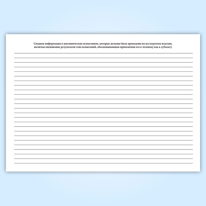 Сводная информация о доклинических испытаниях, которые должны быть проведены на исследуемом изделии, включая оценивание результатов этих испытаний, обосновывающая применения его к человеку как к субъекту ___________________________________________________________________