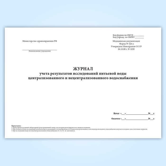 Форма журнала учета результатов исследований питьевой воды централизованного и нецентрализованного водоснабжения (Форма 326-у) соответствует Письму Минздравсоцразвития РФ № 14-6/242888 от 30.11.2009 года о том, что до издания нового альбома образцов учетных форм учреждения здравоохранения по рекомендации Минздрава России используют в своей работе для учета деятельности бланки, утвержденные Приказом Минздрава СССР от 04.10.1980 N 1030.