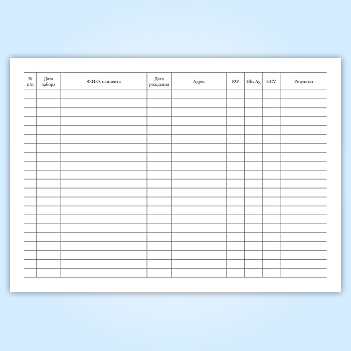 Для учета данных по проведению исследований образцов сыворотки на RW, Hbs, Ag, HCV в медицинских организациях используют этот журнал.