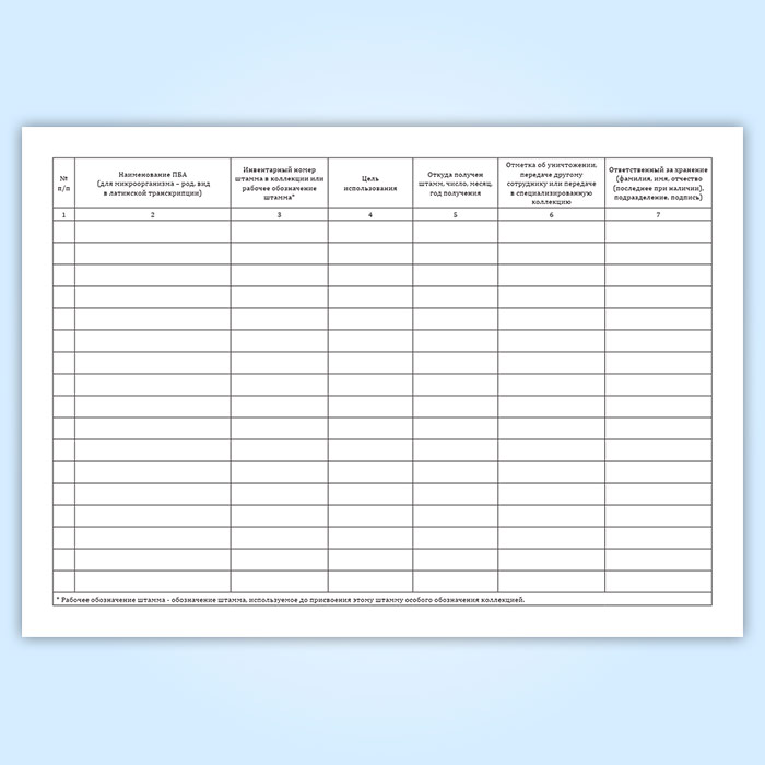 Журнал учета ПБА I-IV групп, находящихся в рабочей коллекции штаммов имеет графы: