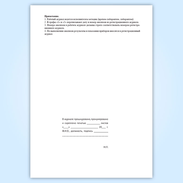 Рабочий журнал ведется исполнителем методик (врачом-лаборантом, лаборантом).
