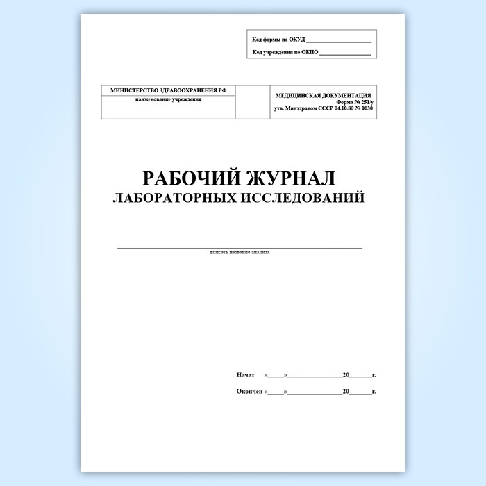 Рабочий журнал лабораторных исследований, форма 251/у, утвержден Приказом Минздрава СССР №1030 «Об утверждении форм первичной медицинской документации учреждений здравоохранения» от 4 октября 1980 г.