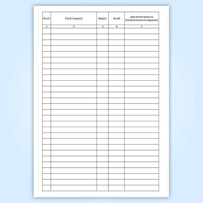 В медицинских лабораториях ведется журнал учета взятия крови на биохимические исследования, СПИД, RW.