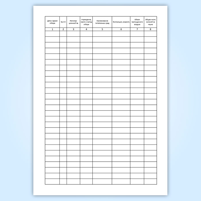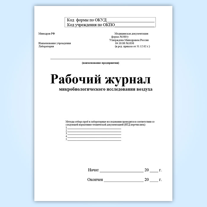 Форма рабочего журнала микробиологического исследования воздуха № 380/у, утверждена Приказом Минздрава СССР №1030 «Об утверждении форм первичной медицинской документации учреждений здравоохранения» от 4 октября 1980 г.