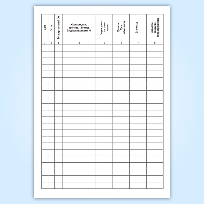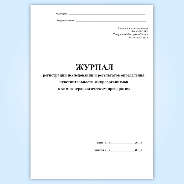Форма журнала регистрации исследований и результатов определения чувствительности микроорганизмов к ХТП форма 254/у, утверждена Приказом Минздрава СССР №1030 «Об утверждении форм первичной медицинской документации учреждений здравоохранения» от 4 октября 1980 г.