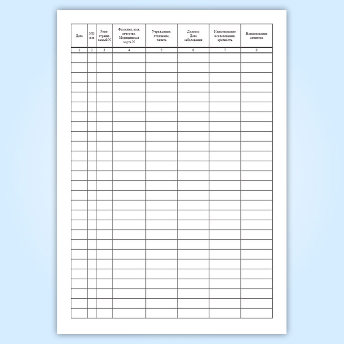 Журнал регистрации серологических исследований (Форма 259/у) имеет графы: