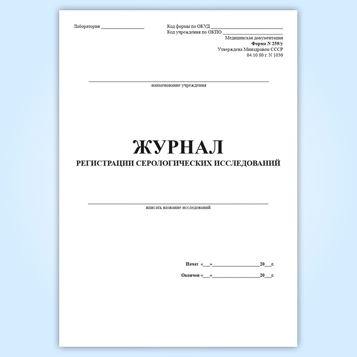 Форма журнала регистрации серологических исследований (Форма 259/у) утверждена Минздравом СССР №1030 «Об утверждении форм первичной медицинской документации учреждений здравоохранения» от 04.10.1980 года (с изменениями на 31.12.2002).