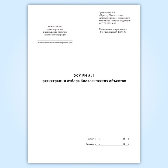 Журнал регистрации отбора биологических объектов (Форма 450у-06) соответствует Приложению № 5 к Приказу Министерства здравоохранения и социального развития Российской Федерации от 27.01.2006 № 40.