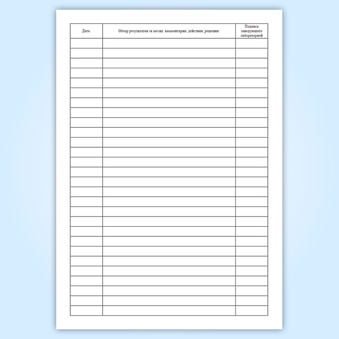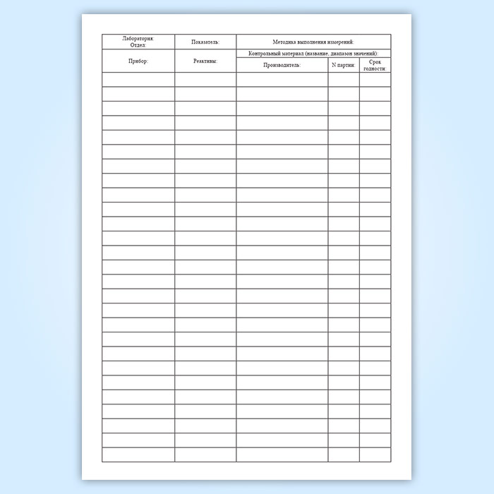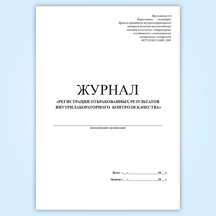 Форма журнала регистрации отбракованных результатов внутрилабораторного контроля качества соответствует Приложению Г к Отраслевому стандарту ГОСТ 91500.13.0001-2003 " Правила проведения внутрилабораторного контроля качества количественных методов клинических лабораторных исследований с использованием контрольных материалов" .